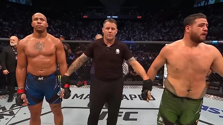 Третий раунд полностью проходит под диктовку Сирила, слишком много сил Туйваса отдал во втором раунде. Удивительно как, но Тай держится, но в итоге Сирилу всё-таки удаётся уронить его и забить до нокаута.