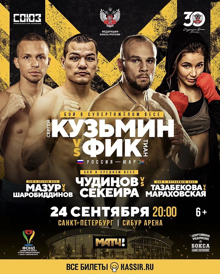 В следующую субботу, 24 сентября, в Санкт-Петербурге в «Сибур Арене» состоится вечер профессионального бокса. В главном бою шоу на ринге встретятся российский тяжеловес Сергей Кузьмин (17-2, КО 13) и Тиан Фик (9-1, КО 5) из ЮАР.