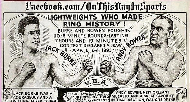 Берк и Боуэн встретились в ринге 6 апреля 1893 года в Новом Орлеане. Бой начался в 21:00 и продлился 110 раундов. Последний отрезок закончился в 4:19, а уже минуту спустя, в 4:20 – единственный оставшийся судья Джон Даффи зафиксировал ничью. Почему последний судья? Потому что за 7 часов 19 минут поединка с трибун начали уходить не только зрители (а некоторые ложились спать прямо здесь же на лавках), но и судьи, которые устали наблюдать этот поистине бесконечный бой. Всего посмотреть поединок пришло около 9 000 человек, цена билета, согласно афишам, составляла 25 центов, что в пересчете на современные деньги эквивалентно примерно 10 долларам. На кону стояло 2 500 тысячи долларов, что на сегодняшние деньги составляет порядка 95 000.