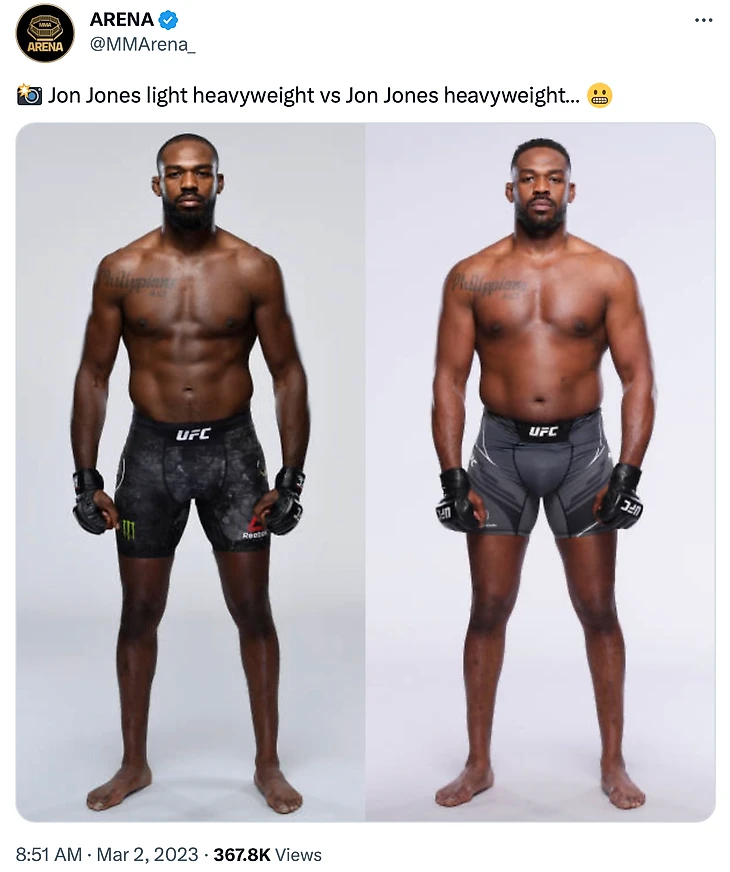 В Твиттере активно обсуждают форму Джона Джонса, сравнивая его нынешний внешний вид с прежним вариантом, когда он выступал в полутяжелом весе.