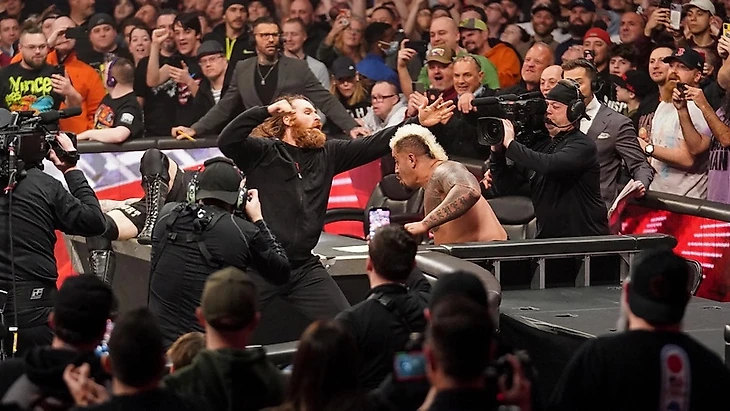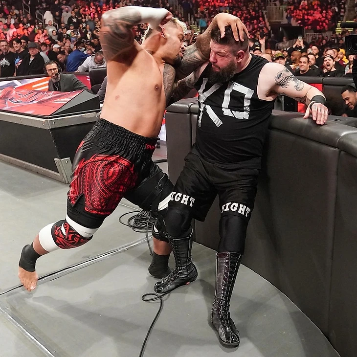 Доброго времени суток, Ассалому Алейкум, дорогие друзья! На связи Юлий Марков, и у меня такое ощущение, что последнее RAW я обозревал не неделю назад, а целую вечность, ибо слишком много событий с тех пор произошло. Тем не менее, вернуться на красный бренд надо, ибо нам обещали потенциально чуть ли не сильнейший выпуск 2023 года. Тут и матч Джонни Гаргано с Финном Балором, и появление Джона Сины, и бой с участием Сэми Зейна, а значит и очередная серия моего любимого сериала. В общем, посмотреть было на что, так что давайте смотреть, пусть и в фигуральном смысле этого слова. «Ранее сегодня» Джимми Усо и Соло Сикоа прибыли на шоу в компании Пола Хеймана. «Адвокат» еще раз решил пройтись по плану. Роман Рейнс очень четко сказал в пятницу, что нужно решить проблему Сэми Зейна. Тем не менее, Сэм сумел сбежать, а значит он жив и появится сегодня на RAW. И это шанс для Bloodline. Пока Соло будет решать проблему Кевина Оуэнса, Джим, вне зависимости, придет Джей наконец в себя или нет, должен наконец разобраться с Зейном. Раз и навсегда. Самоанцы ушли, а Пол потребовал у Siri, чтобы та набрала Романа Рейнса. Мы в Бостоне, штат Массачусетс, на арене TD Garden, и шоу открылось сразу матчем. Кевин атаковал Сикоа, не успел тот зайти в ринг, и рестлеры отправились за пределы ринга, где канадец нанес несколько ударов, запустил недруга в ограждение, но сам был отправлен головой в стойку ринга. А потом еще раз после нескольких ударов. Действо вернулось в четырехугольник, и матч наконец начался, а Оуэнс взорвался еще одной атакой. Соло встретил его своим бэк элбоу, провел несколько киков, хэдбатт. Показалось, что самоанец захватил контроль, но Кев стал отбиваться… чтобы налететь на лег лэриэт. Сикоа продолжил наносить удары, на которые Кевин безрезультатно пытался чем-то ответить. Наконец Оуэнс смог справиться с захватом, провести серию панчей, кик, пару лэриэтов, еще несколько страйков, вновь лэриэт и сентон. От кэннонболла в углу Соло укатился за пределы ринга, получив еще один клоузлайн тут, и Кевин вернул недруга в четырехугольник. Внезапно на арену выбежал Джимми Усо, который отвлек Оуэнса во время восхождение на третий канат. Соло его сбросил, провел хип атаку в углу, и Кев укатился на рингсайд, где получил еще одну хип атаку у ограждения, и шоу ушло на рекламу. Рестлеры вернулись в четырехугольник, где началась тотальная доминация Сикоа, а канадец мог только пытаться показывать характер. В какой-то момент он провел thrust kick в голову, который йвыиграл ему несколько секунд на восстановление. Оуэнс укатился на рингсайд, обрушил поспешившего за ним Соло на апрон, но Соло встретил сентон коленями по возвращении в четырехугольник. Сикоа приготовился к суперплексу, Кевин его заблокировал, и нарвался на самоан дроп до 2. Уйдя от Стингер сплэша в углу, Кевин провел жесткий DDT, и, передохнув, снова начал наносить удары. Соло отбился, но влетел головой в стойку ринга в углу. Станнер Сикоа заблокировал, направил недруга к Джимми на апроне, и канадец вырубил Усо. Затем шарахнул 2 thrust kick в голову оппонента. Кэннонболл от Кевина последовал, Swanton Bomb, но только до 2, потому что Джимми разбил удержание и начал избивать Оуэнса. Как итог «КейОу» победил по дисквалификации, а Усо вытащил победителя за пределы ринга и запустил в ступеньки, приказав Соло расчистить комментаторский стол. И Джим стал забивать О
