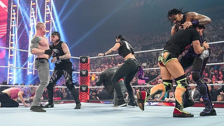 Получив немало атак Доминика, Джон начал отбиваться, затем избежал 619 и провел слингшот гарпун. Смена составов на Приста и Лумиса, последний провел серию страйков и спайнбастер. Спайнбастер Дому, несколько атак обоим в углу, бульдог Мистерио. Дэмиэн пострадал от связки из бэк суплекса и легдропа, но вырвался из удержания. Уйдя от следующей атаки, Прист передал «слепой» тэг Доминику и был отправлен за пределы ринга. Мистерио же провел кик в голову, вышел на сворачивание, положив ноги на канат, но их с каната скинула ЛеРэй, чем вызвала гнев Рии. Пока Доминик и Декстер провели друг друг синхронные лэриэты, Рипли была запущена в ступеньки, но увернулась от кика и провела фэйсбастер с электрического стула Кэндис на баррикаду. На это обратил внимание Декс, но Рипли оказалась единственным человеком в WWE, который не боится Лумиса. Прист же провел ему лэриэт и вернул «маньяка» в четырехугольник. Флэтлайнер, тэг Доминику, фрогсплэш от Мистерио, и Джони разбил удержание в самый последний момент. Гаргано вырубил Дэмиэна суперкиком, провел суисайд дайв, когда тот выпал за пределы ринга, но получил бейсбол слайд от Дома. Уйдя от суплекса, Лумис поймал Мистерио в Silence, но Мистерио сумел в таком положении дойти до своего угла и передать слепой тэг Дэмиэну. Тот провел кик в голову Декса и добил его коронным South of Heaven.