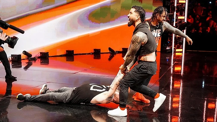 Поднявшись туда, он увидел, что ему придется проследовать за противником снова на рингсайд. Тут Кев нанес несколько ударов стулом, установив потом шесть стульев рядом друг с другом в ринге. Уложив на них Соло, Кевин хотел полететь на визави с угла, но Сикоа прервал это дело, задумав суперплекс на стулья. Оуэнс заблокировал опаснейший бросок, провел несколько хэдбаттов, но Соло в конечном счете сбросил канадца с третьего каната на груду стульев. «Holy Shit!» - отреагировали фанаты, самоанец стал удерживать визави, но Кев вырвался. Укатившись на рингсайд, Оуэнс атаковал неприятеля об апрон и стойку ринга, шарахнув кэннонболл в баррикаду. Драка продолжилась в зрительском зале, Оуэнс привел Соло на стэйдж, впечатал в LED-экран, отвел за кулисы, и тут канадец получил двойной thrust kick в голову от Джимми и Джея Усо. Усо притащили Кевина обратно на ринг, закинула туда, провели еще раз двойной суперкик, Сикоа шарахнул Samoan Spike и одержал победу. На торжествующих Bloodline шоу завершилось.