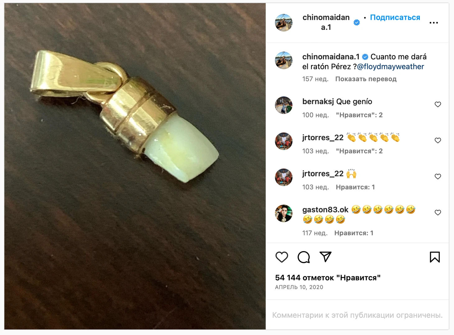 Аргентинец выложил кулон в соцсетях, отметив Мейвезера. Он также написал: «Сколько даст мне мышь Перес?».
