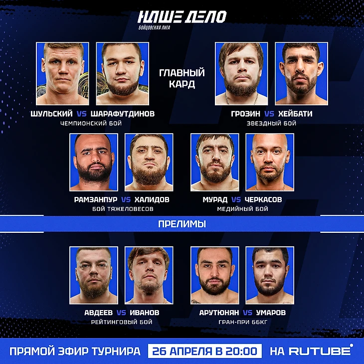 26 апреля пройдет турнир бойцовской лиги “Наше Дело” в прямом эфире на RUTUBE. Уже через неделю будет известно имя второго финалиста звездного международного Гран-При в легком весе и первого полуфиналиста Гран-При до 66 кг! Всех зрителей ожидает титульный бой Павла Шульского против действующего чемпиона Дамила Шарафутдинова. Ну и, конечно, долгожданный реванш Мурада Легенды против Андрея Черкасова.