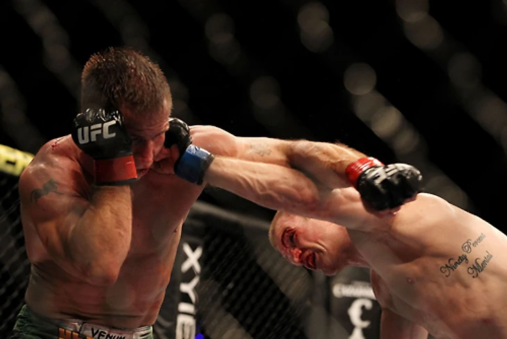 Настоящее: Дейна Уайт написал в твиттере: «Robbed! Judging fucking SUCKS!!!!». Догадайтесь, о каком бое. При условии, что два предыдущих сообщения были о крутизне рубки и рассечении. Шэрк действительно классно врубил локтем, стоило только Данэму взять передышку для подготовки очередного удушения. Сколько он их там наштамповал, три-четыре? Духовитость Эвана поражает: сечка была далеко не самая маленькая, и получил он ее в первом раунде, а в третьем Шэрк только и мог, что тереться спиной о сетку, выхватывая очередную порцию летящих коленей от своего оппонента. Данэму немного не хватило выдержки что ли: моторный, упертый, агрессивный, по-хорошему безбашенный (последние атаки). Хотя причем тут выдержка? Справедливости не хватило.