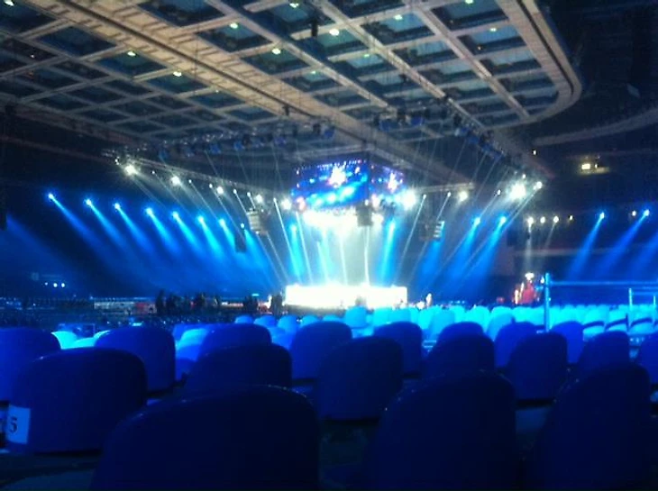 23.54. За час до главного боя зал «Олимпийского» заполнен много меньше половины. Похоже, автобусы желто-голубой раскраски с толпами украинских болельщиков еще крадутся где-то в ночи.
