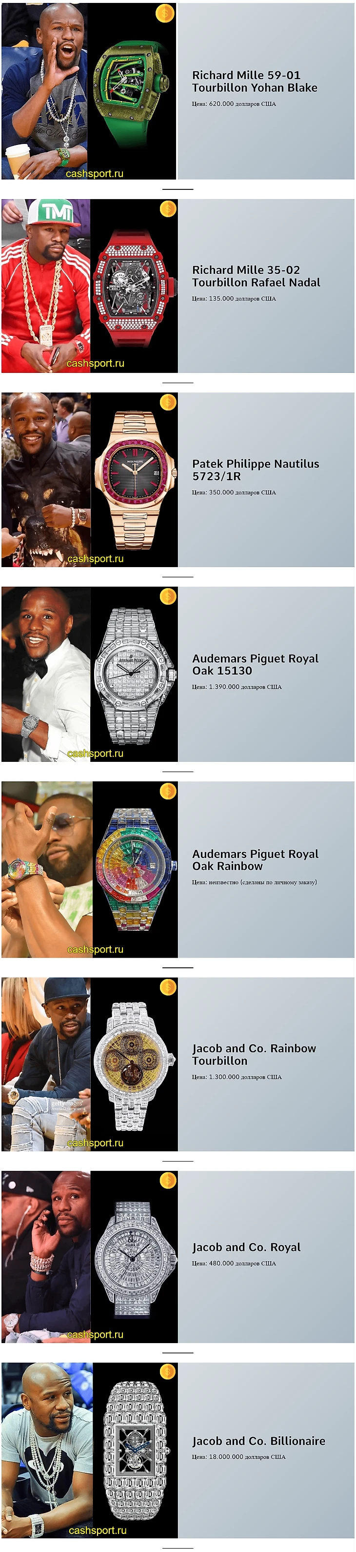 ⌚️Как и обещали, представляем коллекцию часов Флойда Мейвезера. Боксер заработал более миллиарда долларов за свою карьеру, успешно продвигается в бизнесе, а потому нередко радует себя дорогущими аксессуарами.