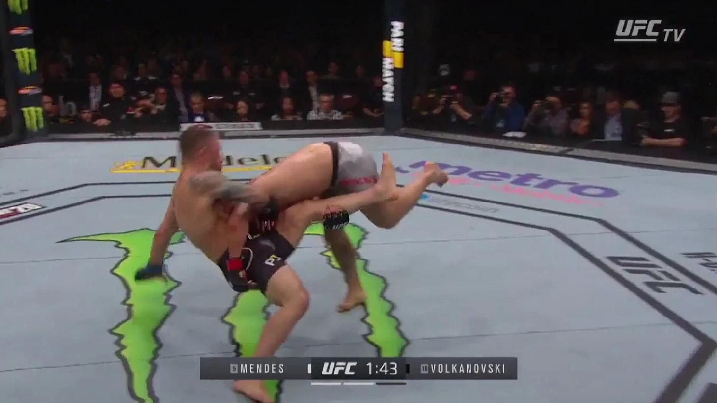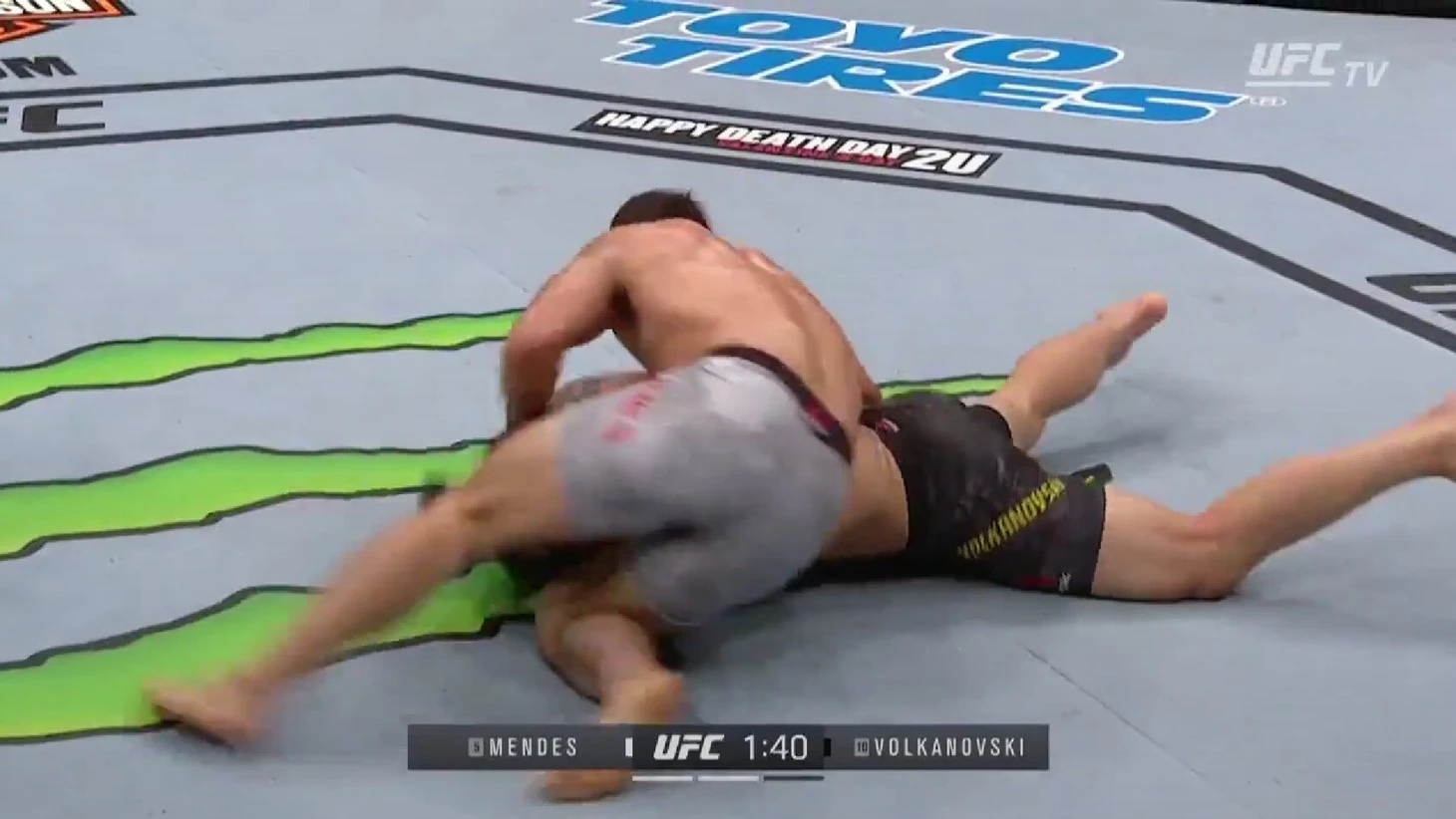 Мендес забрал спину, но из-за широкой базы Волкановски не закрыл замок ногами – и они вернулись в стойку. Волкановски дожал и закончил бой техническим нокаутом.