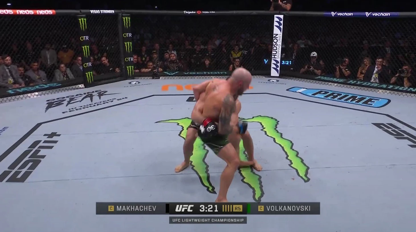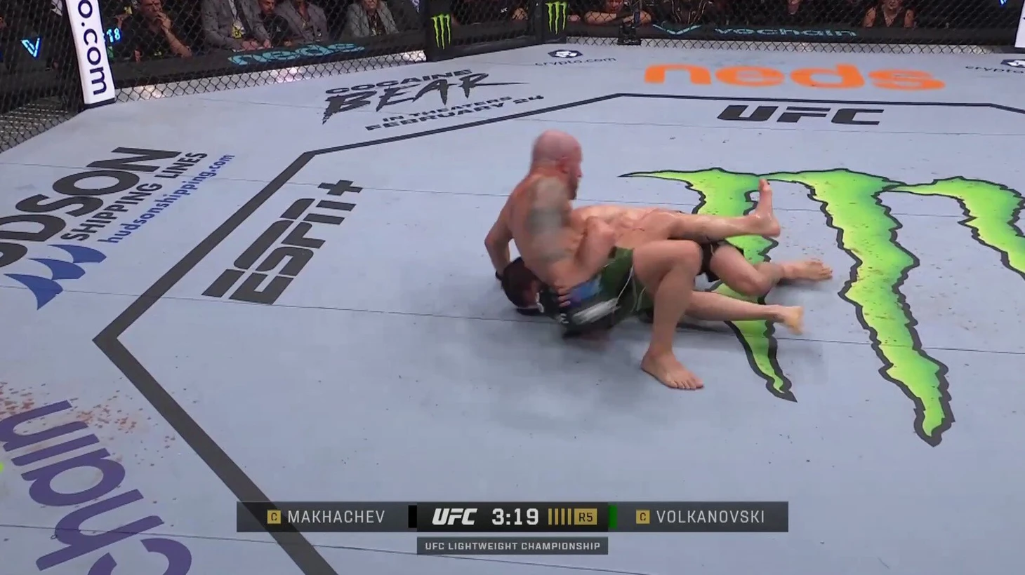 Это позволило Волкановски избежать контроля сверху и сделать ролл в сторону Махачева. После этого Волкановски сделал спрол и так защитился от тейкдауна.