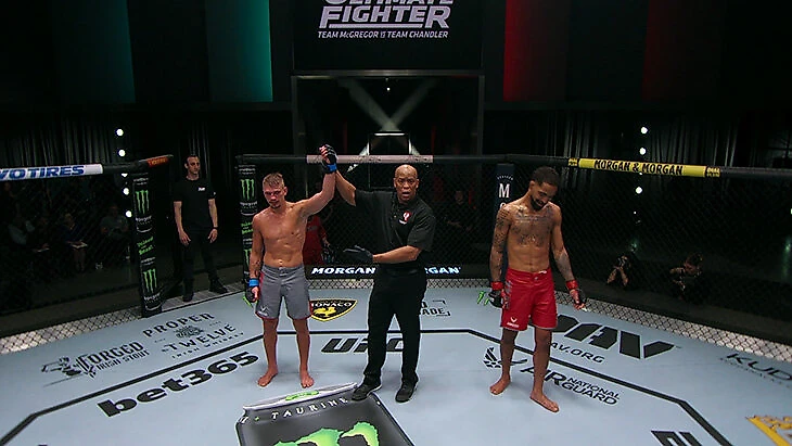 Во время первого полуфинального боя между Остином Хаббардом и Рузвельтом Робертсом Макгрегор стоял у клетки с отрешенным видом – ему не за кого было болеть. Чендлер выбрал нейтральную позицию и не помогал ни одному из бойцов, поэтому на Apex Arena было необычайно тихо.