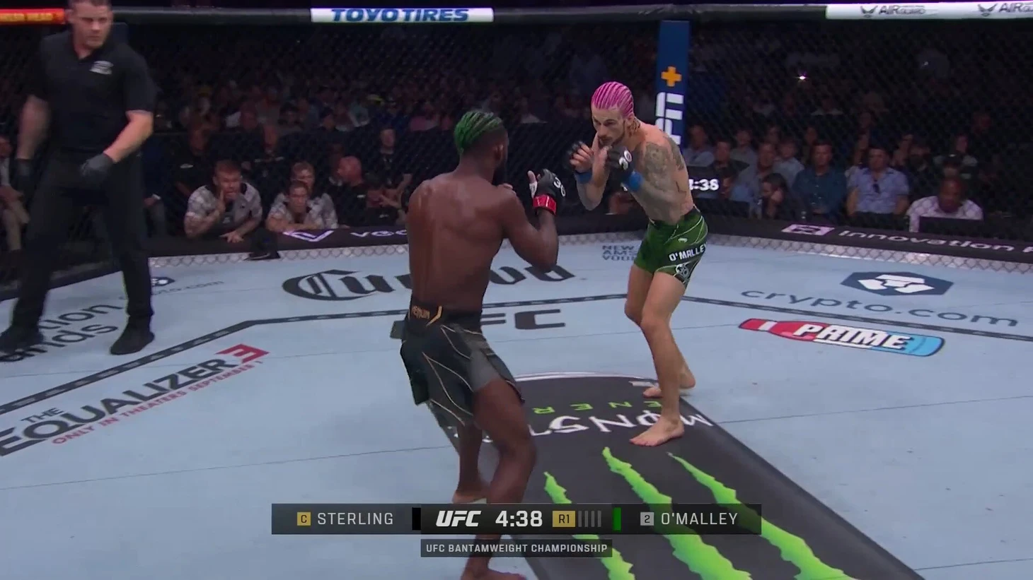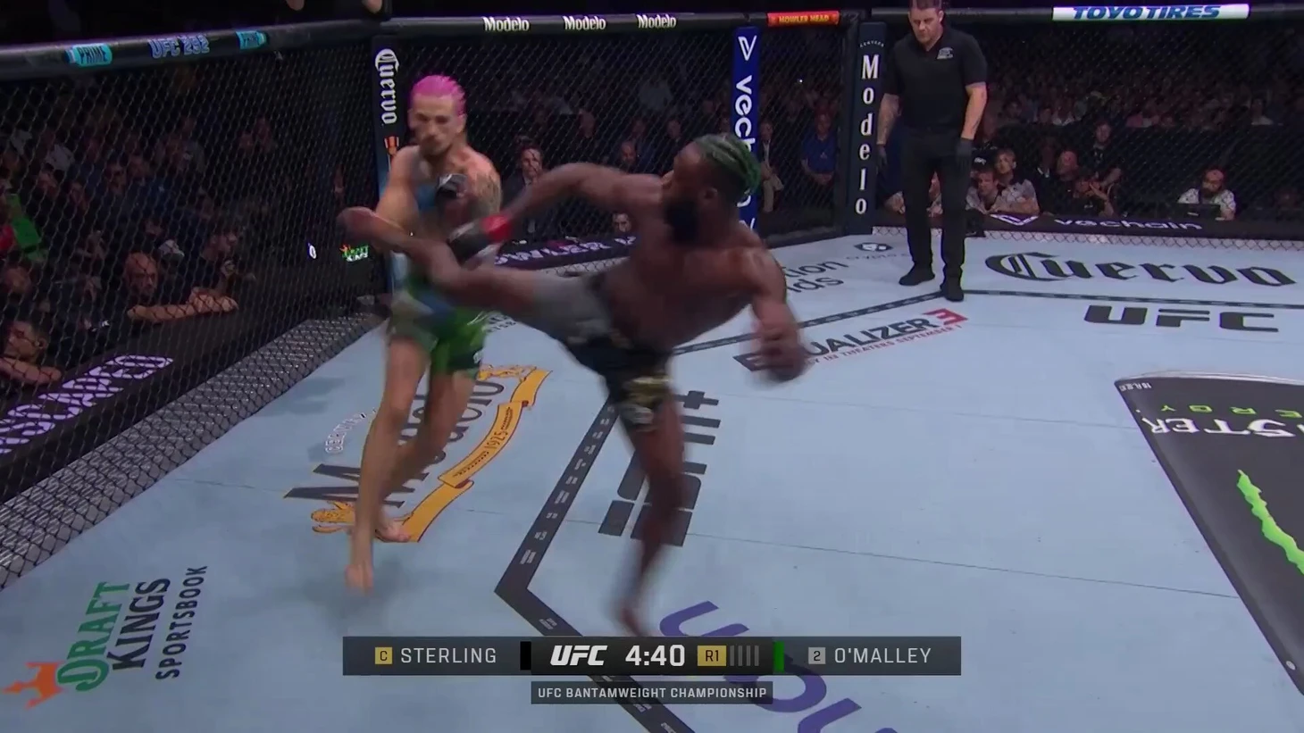Во втором раунде Стерлинг заходил на тейкдаун после падения О’Мэлли, но тот отлично справился с этой попыткой за счет контроля кисти Алджо. После чего случился нокаут, который был классикой О’Мэлли всю его карьеру (об этом мы также писали в профайле Шона).