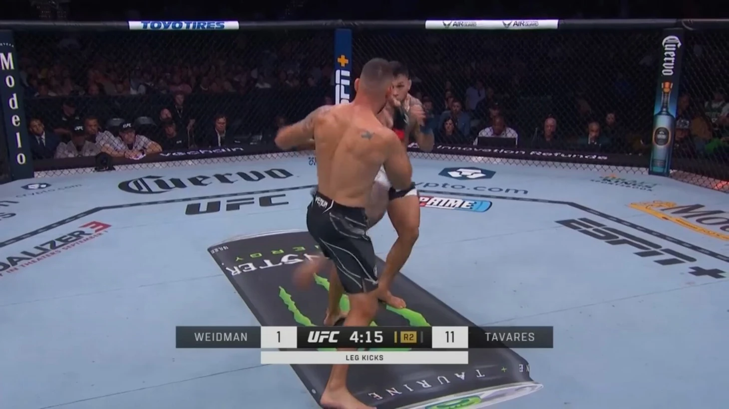 Ключевой проблемой Вайдмана стала стойка – он слишком сильно опирался на левую ногу из-за боязни получить рецидив травмы на правой ноге. Такая стойка Тавареса позволяла атаковать переднюю ногу. Он ей отлично воспользовался, пробив за поединок 45 лоу-киков. Один из них привел к разрыву крестообразных связок колена Вайдмана.