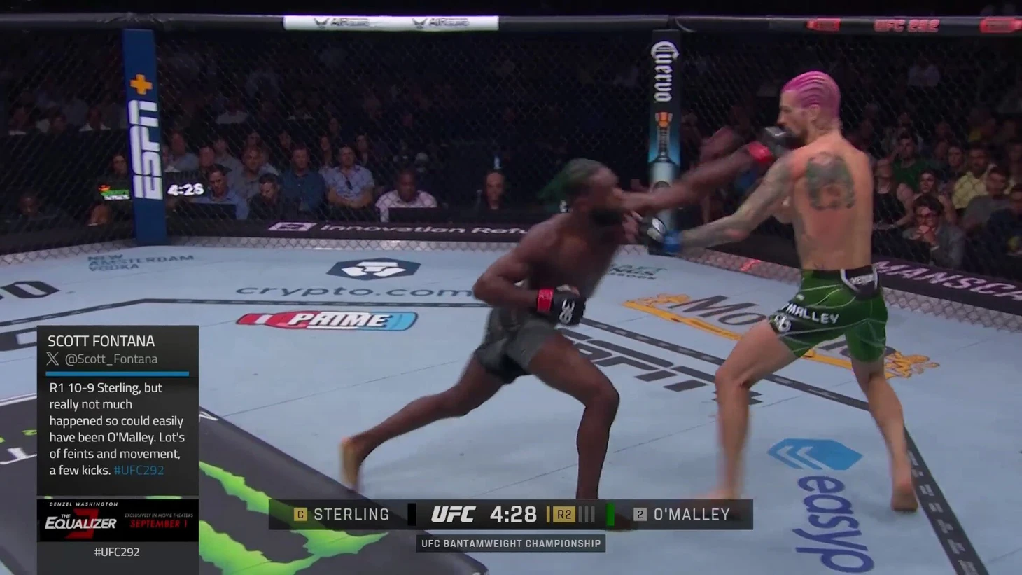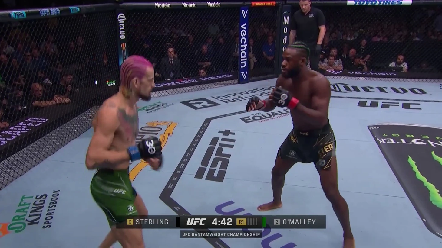 В тактическом профайле Шона О’Мэлли мы отмечали, что для победы над Стерлингом ему нужно постоянно двигаться, уходить от края клетки и прессинга. О’Мэлли пользовался каждой ошибкой и неосторожным движением Стерлинга, чтобы уйти от сетки и занять центр октагона.