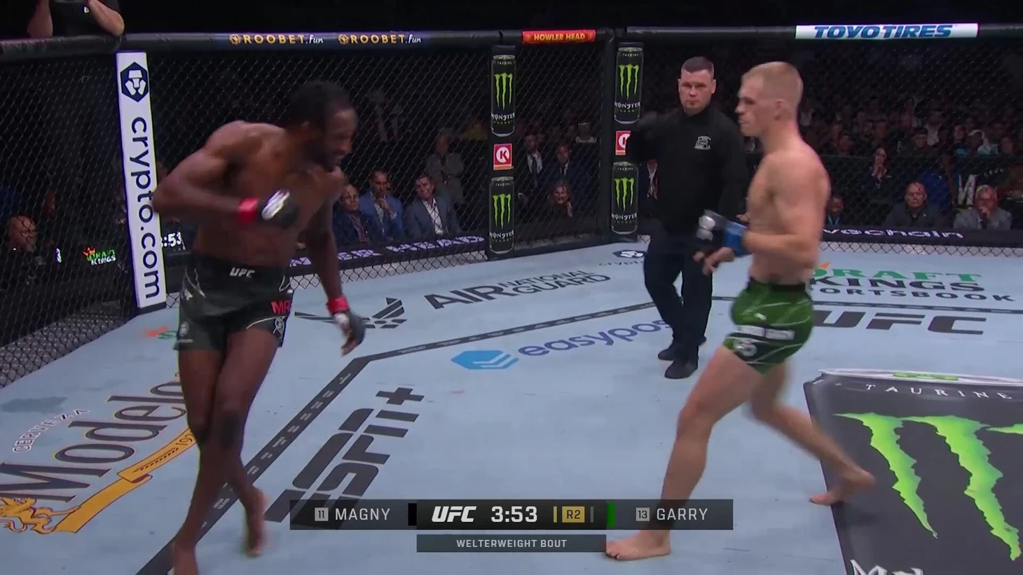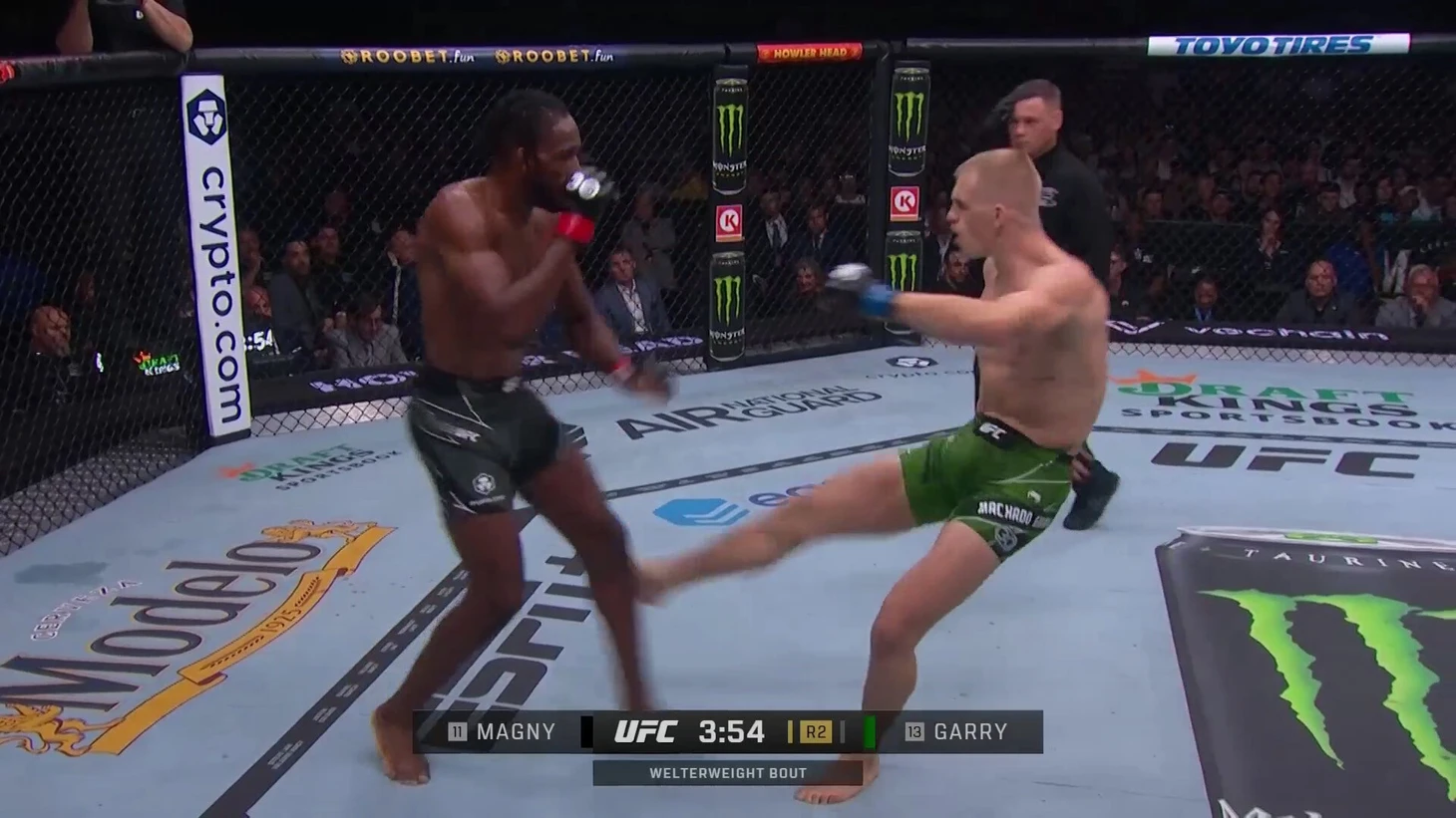 Гэрри пробивал Мэгни еще в первом раунде. Он повредил его ногу первым же лоу-киком, после чего подбил ее еще несколько раз, при этом не заходя в партер. Во втором раунде Гэрри окончательно выбил ногу соперника.