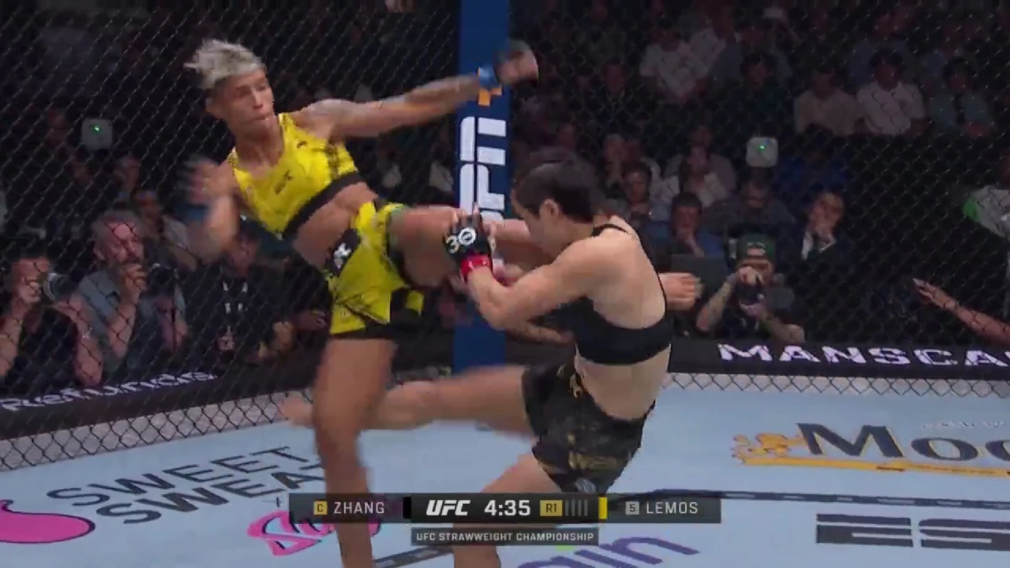Вэйли Чжан была одним из самых больших фаворитов турнира и полностью оправдала ожидания. Против Аманды Лемос, спортсменки с высокой нокаутирующей мощью, она выбрала лучшую тактику – измотать в партере, нагрузить мышцы рук соперницы и лишить главного козыря. Все снова началось с лоу-кика, как уже было в бою Мэгни – Гэрри и Вайдман – Таварес.
