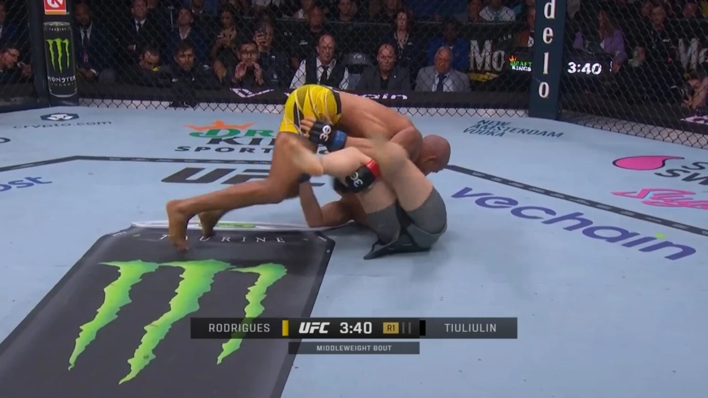 Родригес вернулся в партер и улучшил позицию сначала до маунта, а потом до бэк-маунта, откуда финишировал Тюлюлина