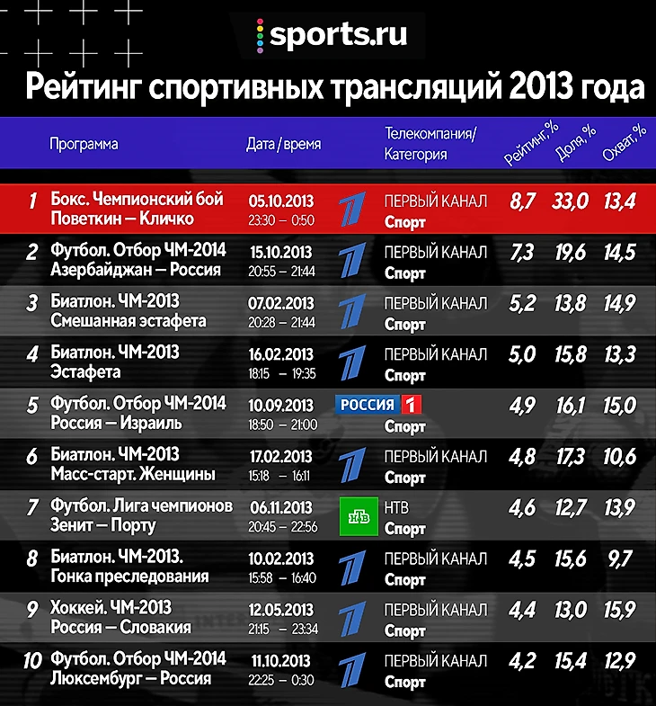 В тройку попали отборочный матч к ЧМ-2014 между сборными России и Азербайджана (рейтинг – 7,3%, доля – 19,6%, охват – 14,5%) и смешанная эстафета на чемпионате мира по биатлону (рейтинг – 5,2%, доля – 13,8%, охват – 14,9%). По боксу в десятку попала только трансляция боя Поветкина и Кличко, все остальное – футбол, хоккей и биатлон.