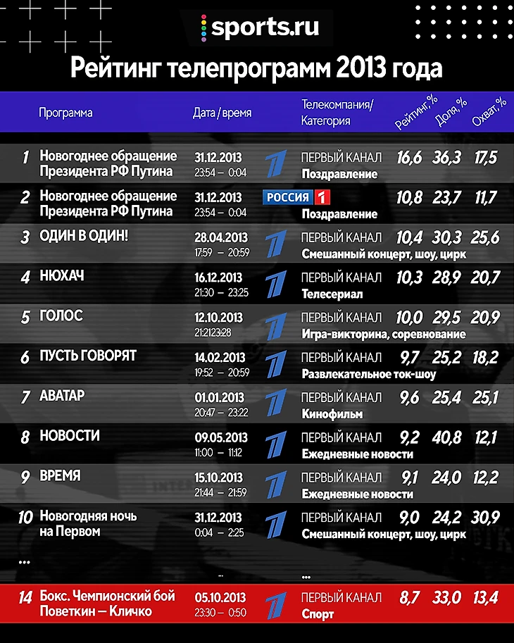 И это стало самым рейтинговым спортивным событием на российском телевидении в 2013 году. По данным исследовательской компании Mediascope, у которой Sports.ru запросил подробные данные, рейтинг трансляции составил 8,7%, доля – 33%, охват – 13,4%.
