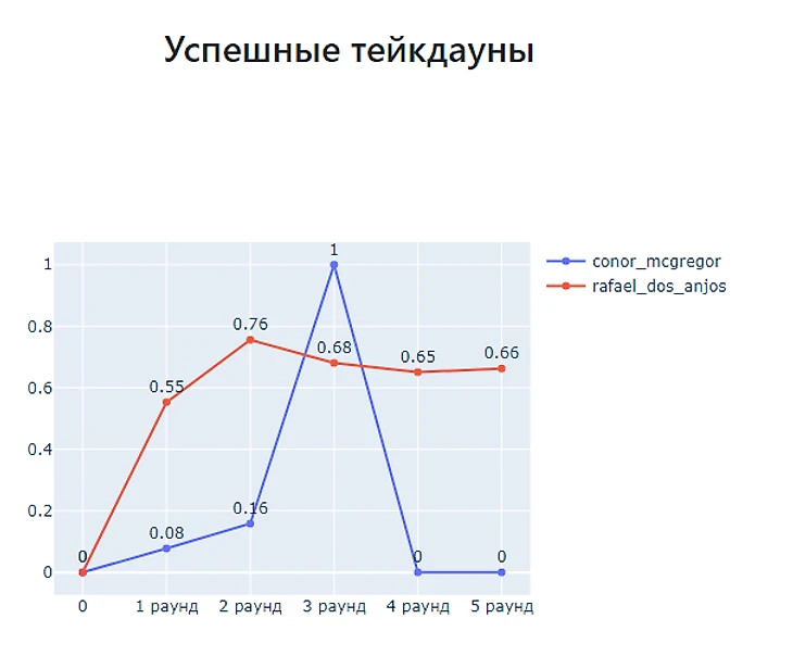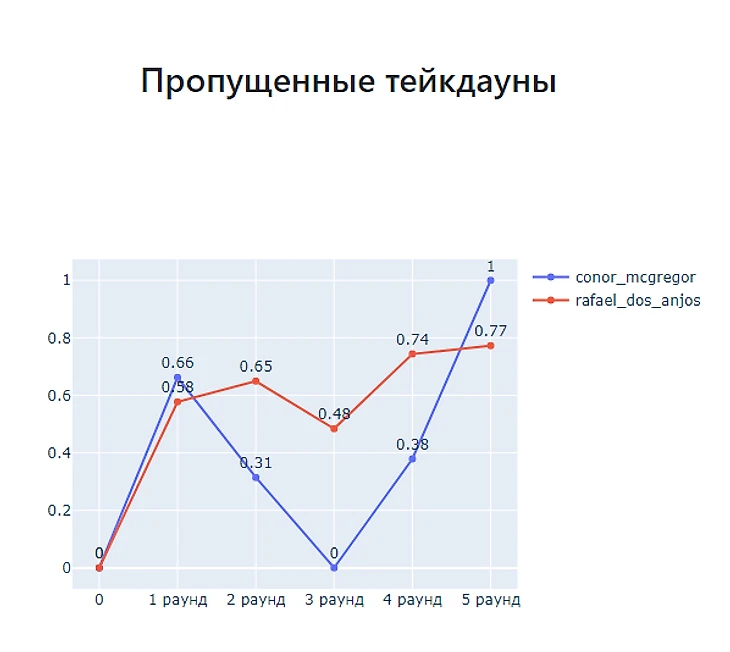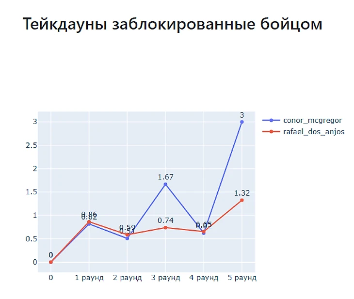 Дос Аньос стабилен. Проводит одно и тоже количество тейкдаунов от раунда к раунду. А вот МакГрегор выходит на пик в третьем раунде и в среднем проводит 1 тейкдаун. А дальше по нулям. То есть что-то происходило в 4 и 5 раунде. Что?