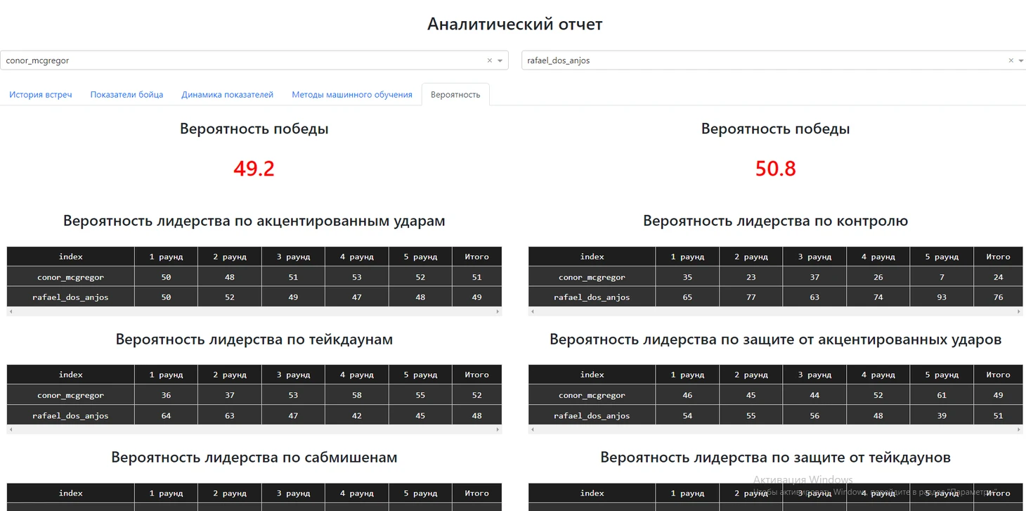 Итог? Равный бой, с завершением в пятом раунде. Два сценария: Либо МакГрегор нанес необходимое кол-во акцентированных ударов Дос Аньосу и отрпавил того в нокаут, либо дос Аньос победил бы уставшего МакГрегора в пятом раунде, проведя ему болевой прием. Машинное обучение отдает предпочтение варианту с победой МакГрегора, а алгоритм «sports research» отдает 0,8% в сторону Дос Аньоса.