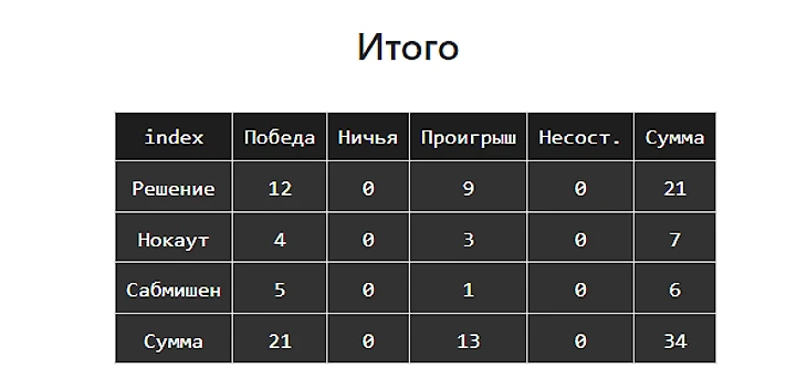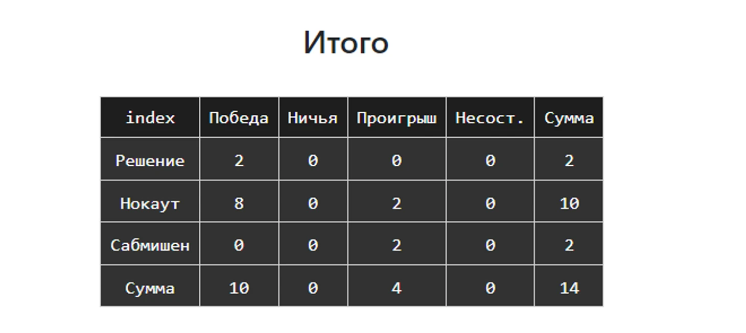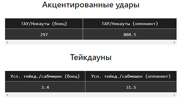 Видите показатель ТАУ/Нокауты (оппонент). Он показывает, сколько ударов оппонентов приходится на один нокаут у бойца. У дос Аньос этот показатель в 808 акцентированных ударов. Видимо челюсть у него гранитная. За два раунда ее точно не пробить. А вот за пять, вполне возможно.