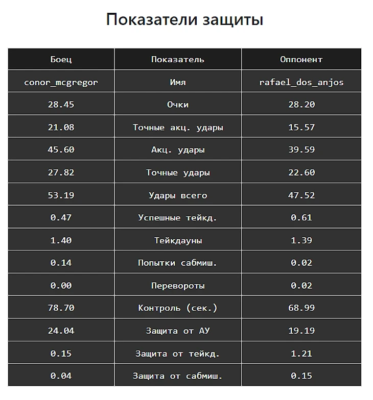 Как набирали очки его оппоненты. Все тоже самое. Точные удары, тейкдауны, контроль, защита от тейкдаунов и защита от акцентированных ударов. Видимо, за 38 боев у Дос Аньоса попадались бойцы разнообразнее, чем у МакГрегора. Либо у МакГрегора просто защита была лучше?