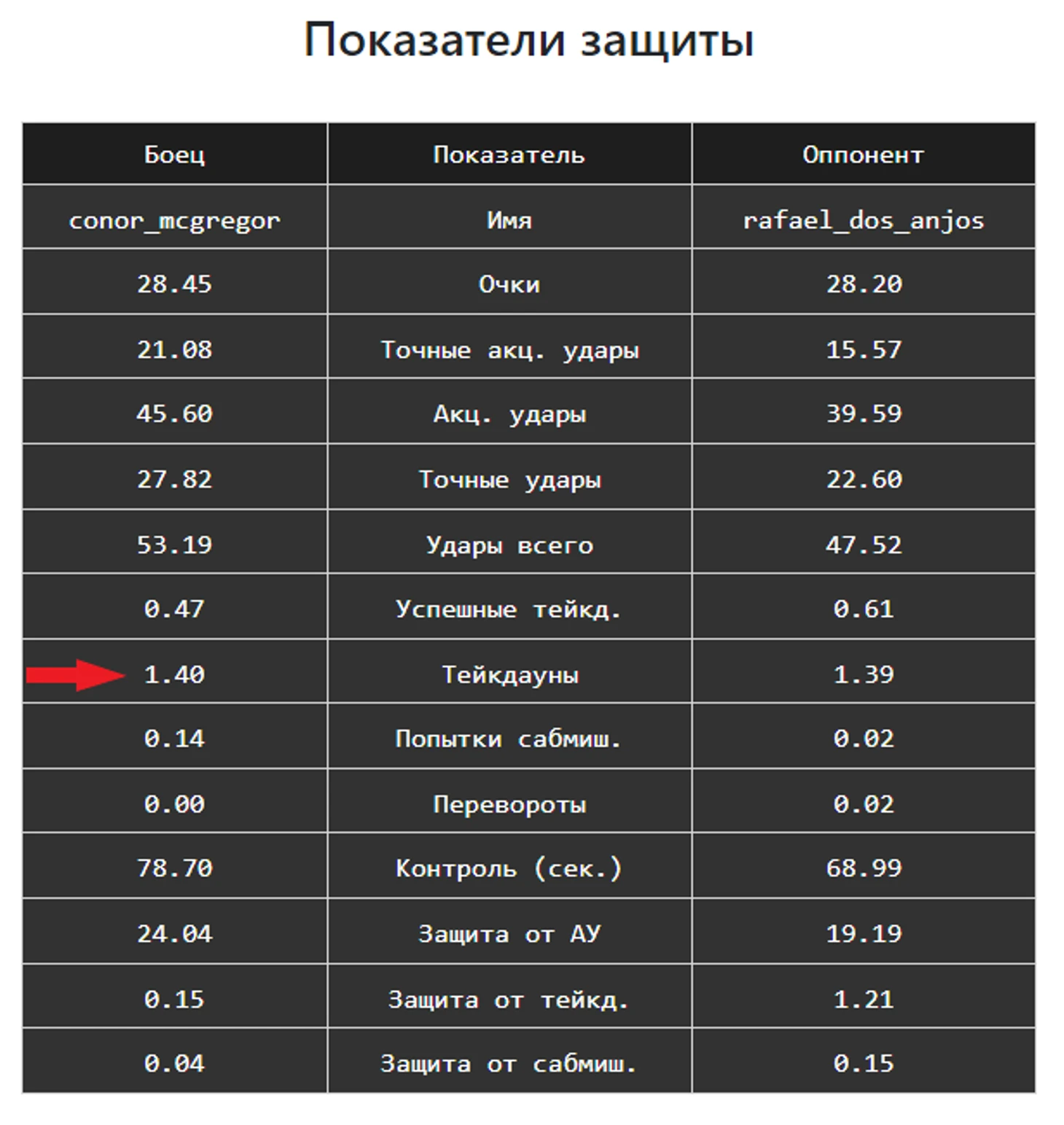 Возьмем строку «Очки», и посмотрим, за счет чего МакГрегор обычно зарабатывает «любовь» судей. На первом месте идут «Точные акцентированные удары». То есть существует прямая зависимость между количеством точных ударов и заработанными очками (если бы коэф. шел с минусом, то это была бы обратная зависимость, аля чем больше бьет тем меньше очков зарабатывает). Смотрим дальше. «Защита от акцентированных ударов» тоже выделен зеленным цветом и равен 0,79. То есть и защищаясь от ударов оппонентов, судьи добавляли ему балов. И наконец третий показатель «Защита от тейкдаунов». Вот тут уже нужно быть внимательным. Показатель не такой уж и значимый, но все равно существенный для этого бойца. Скорее всего МакГрегору пытались часто провести тейкдаун, от которых он защищался и судьи присуждали ему дополнительные балы. Проверим эту гипотезу. Смотрим в средние показатели оппонентов и видим, что в среднем за раунд ему пытались провести 1,4 тейкдауна.