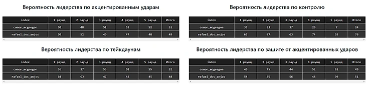 Вероятность того, что МакГрегор нанесет больше акцентированных ударов: 51 на 49. То яркого лидера нет. Вероятность того, что дос Аньос будет лидировать в показателе контроль: 76%. То есть он яркий лидер в этом показателе. Более того, в 5 раунде эта вероятность составляет 93%. И так далее. Не нужно смотреть динамику, средние, абсолютные значения, а можно просто посмотреть распределение вероятностей и сделать выводы. А вывод такой, что общая вероятность победы составляет 49,2% в пользу МакГрегора против 50,8% в пользу дос Аньоса. Не устраивает?