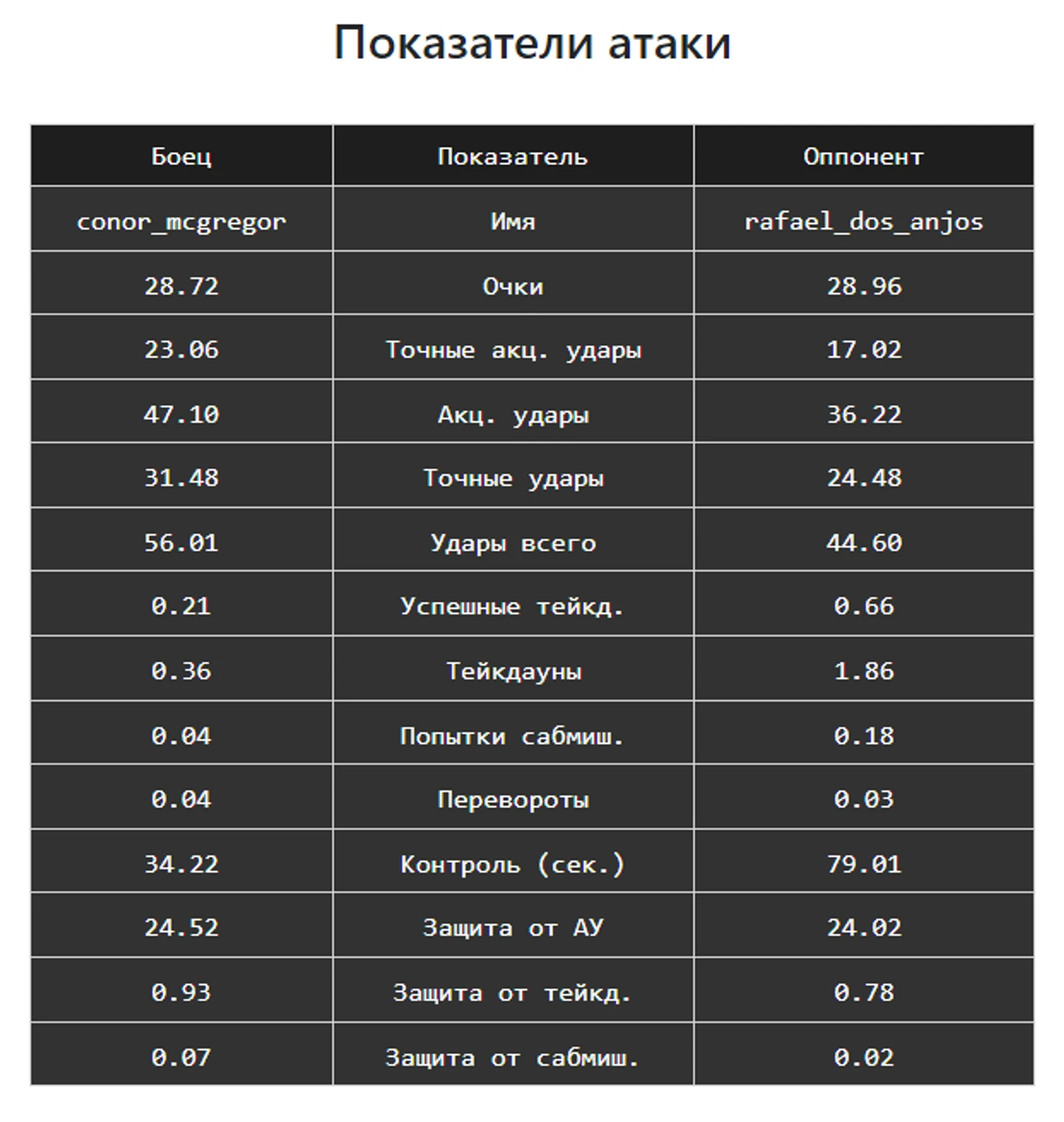 Например коэф. нокаутирующей силы. Он равен ТАУ/нокауты. То есть сколько в среднем приходится Точных акцентированных ударов, чтобы отправить оппонента в нокдаун. У МакГрегора этот коэф. равен 46.08. То есть ему нужно в среднем 46 точных акцентированных ударов, чтобы отправить оппонента в нокаут. А учитывая, что он за раунд наносит в среднем 21 таких ударов, получается, что ему понадобится около 2 раундов, чтобы отправить оппонента в нокаут. С другой же стороны, у дос Аньос этот показатель равен 297.