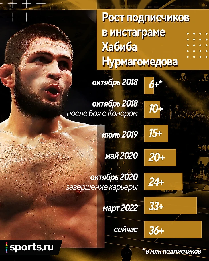 Победа над Конором = 4,5 млн новых подписчиков за двое суток. После завершения карьеры инстаграм Хабиба вырос на 10 млн