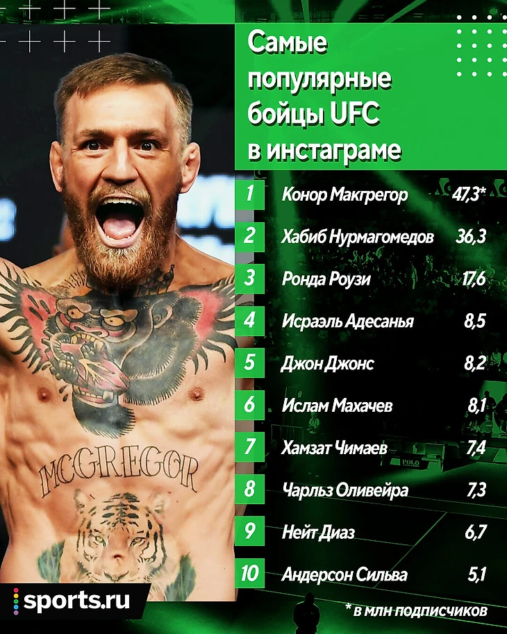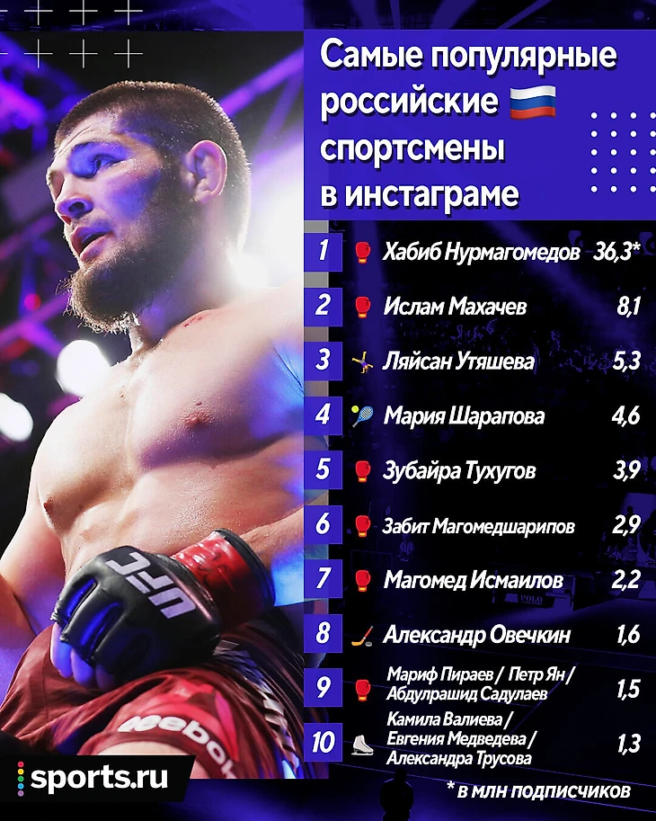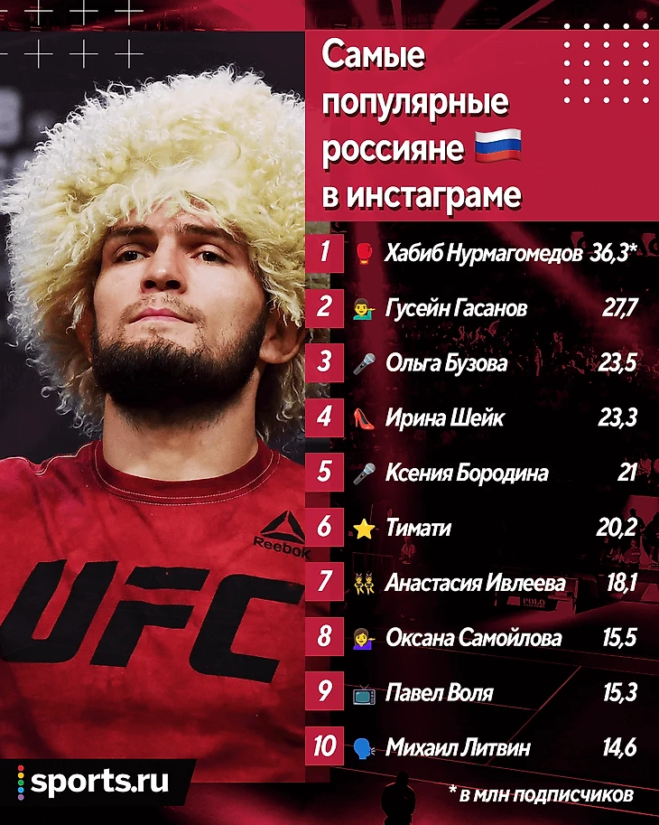 Хабиб не самый популярный боец UFC (больше подписчиков у Конора – 47,3 млн) в инстаграме, но уверенно лидирует среди российских селебрити. Он единственный спортсмен в топ-10 и единственный, у кого больше 30 млн подписчиков. Данные на 1 января-2024: