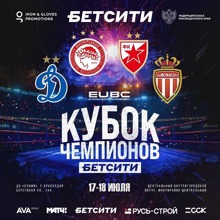 Боксёрский турнир «БЕТСИТИ. EUBC КУБОК ЧЕМПИОНОВ» с участием команд «Динамо», «Монако», «Олимпиакос» (Греция), «Црвена Звезда» (Сербия) состоится 17-18 июля в Краснодаре. Соревнования пройдут в семи олимпийских категориях (51 кг, 57 кг, 63,5 кг, 71 кг, 80 кг, 92 кг и свыше 92 кг) и по системе на вылет: 17 июля состоятся полуфинальные поединки между спортивными обществами европейских стран, а 18 июля – финал и матч за третье место.