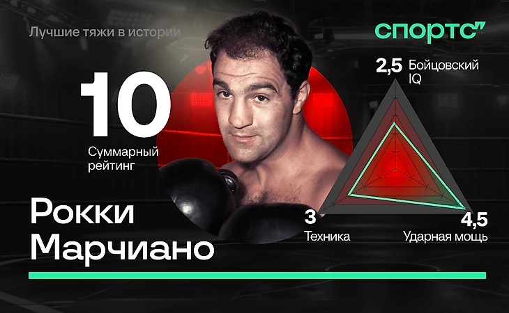 Марчиано – один из самых переоцененных чемпионов в истории тяжелого веса, хотя номинально у него очень крутой уровень соперников: Джерси Джо Уолкотт (дважды), Эззард Чарльз (дважды), Джо Луис, Арчи Мур, Роланд Ластарза (дважды).