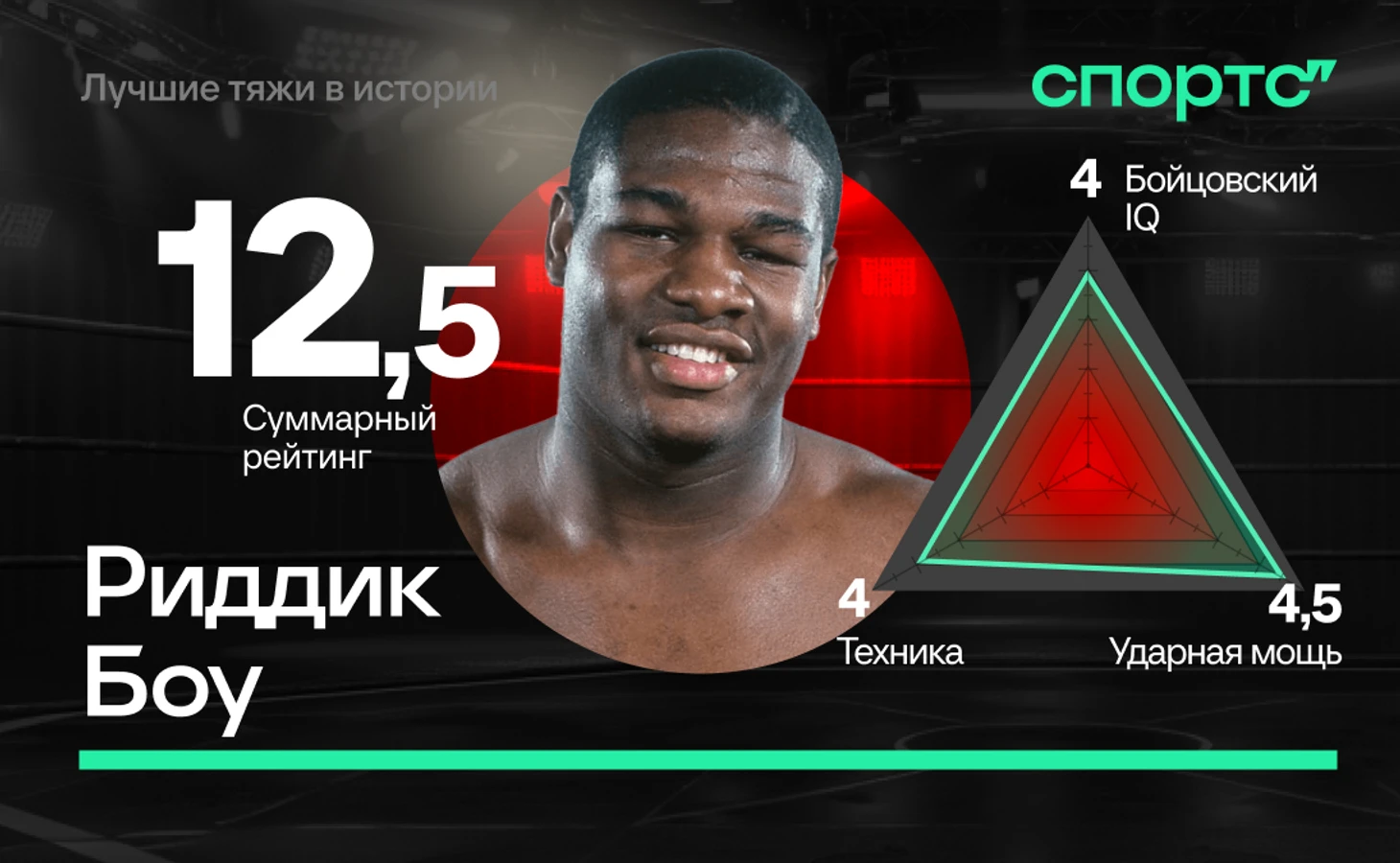 Трудно найти более противоречивого чемпиона в истории тяжелого веса, чем Риддик Боу. Из плюсов – выигранная трилогия у Холифилда и звание абсолютного чемпиона мира. Из минусов – выброшенный в урну пояс WBC после отказа от боя с Льюисом, которому Боу проигрывал на Олимпиаде, и ранний конец карьеры в 29 лет.