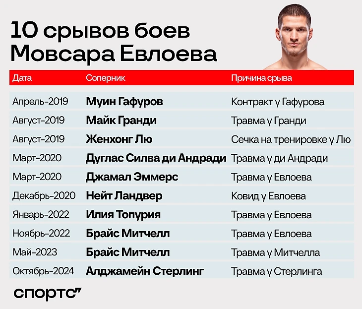 Мовсару Евлоеву сильно не везет в UFC: за пять лет в лиге он набил рекорд 8-0, но до сих пор не получил титульник. Победа над Алджамейном Стерлингом на UFC 307 могла приблизить его к этому, но соперник снялся с поединка из-за травмы. Здесь еще одна проблема Евлоева – у него очень часто срываются бои.