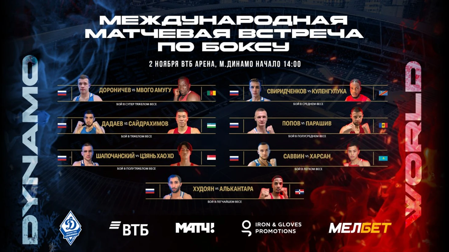 Международная матчевая встреча по боксу между сборной «Динамо» и сборной мира пройдет 2 ноября на «ВТБ Арене» в Москве. Соревнования пройдут в семи олимпийских весовых категориях, а бои будут состоять из трёх раундов по три минуты. Турнир будет организован Iron&Gloves Promotions при поддержке общества «Динамо» и Федерации бокса России. Основными партнерами вечера бокса станут букмекерская компания «Мелбет» и ПАО банк ВТБ.