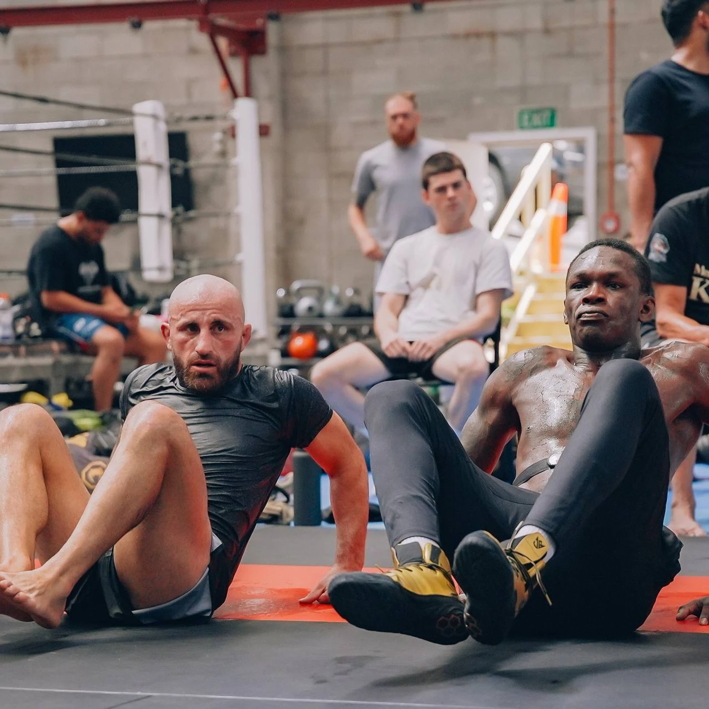 Нассурдин Имавов первым появляется у клетки, за ним – Исраэль Адесанья. Оба максимально спокойные