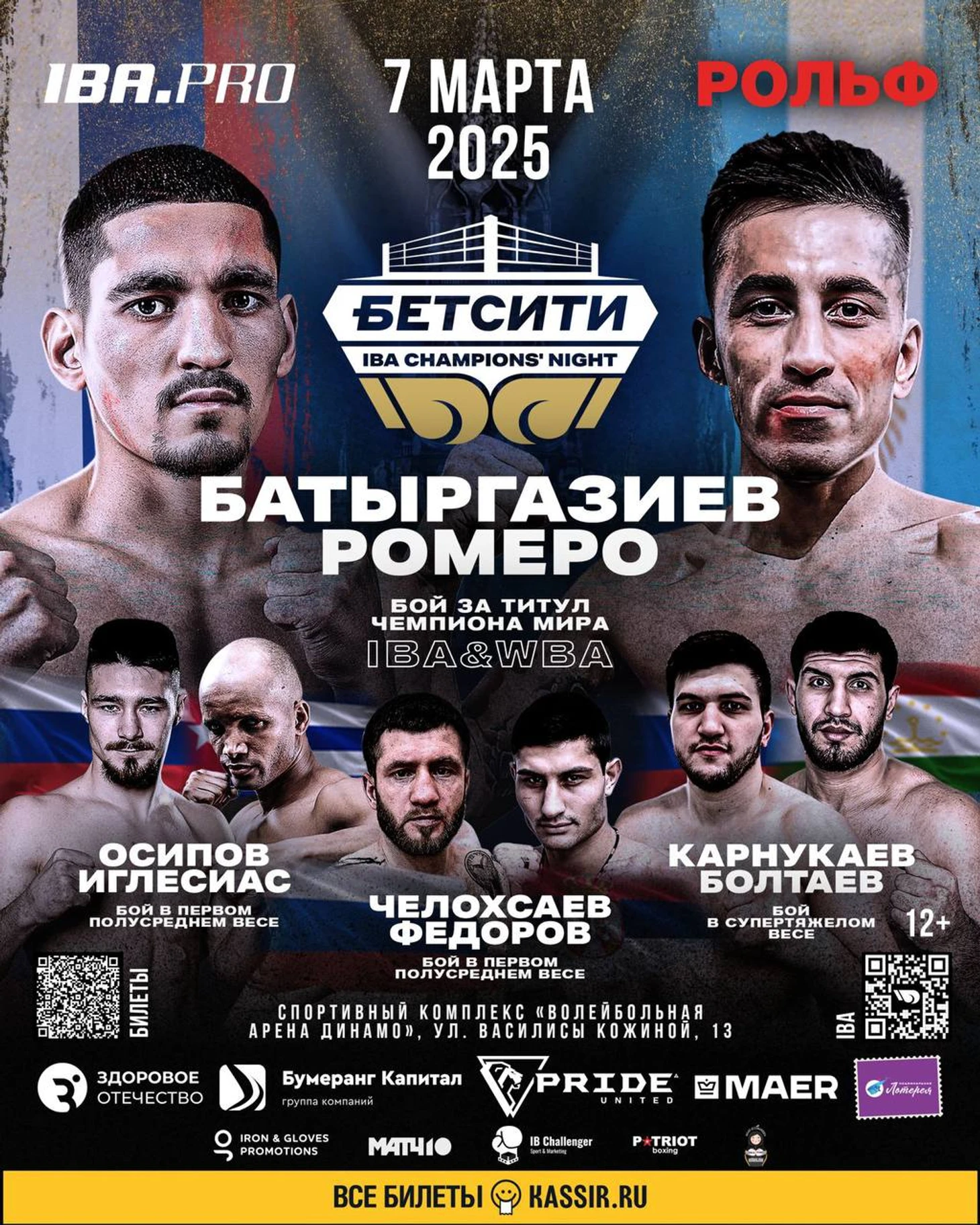 Олимпийский чемпион-2020 россиянин Альберт Батыргазиев (11-0, КО 8) 7 марта в Москве проведёт защиту пояса временного чемпиона мира по версии WBA во втором полулёгком весе и титула чемпиона IBA в весе до 60 кг в поединке против аргентинца Нери Круза Ромеро (18-0, КО 10). Этот 12-раундовый бой возглавит турнир БЕТСИТИ Ночь чемпионов IBA, который будет организован Iron&Gloves Promotions, Patriot Boxing при поддержке Международной ассоциации бокса.
