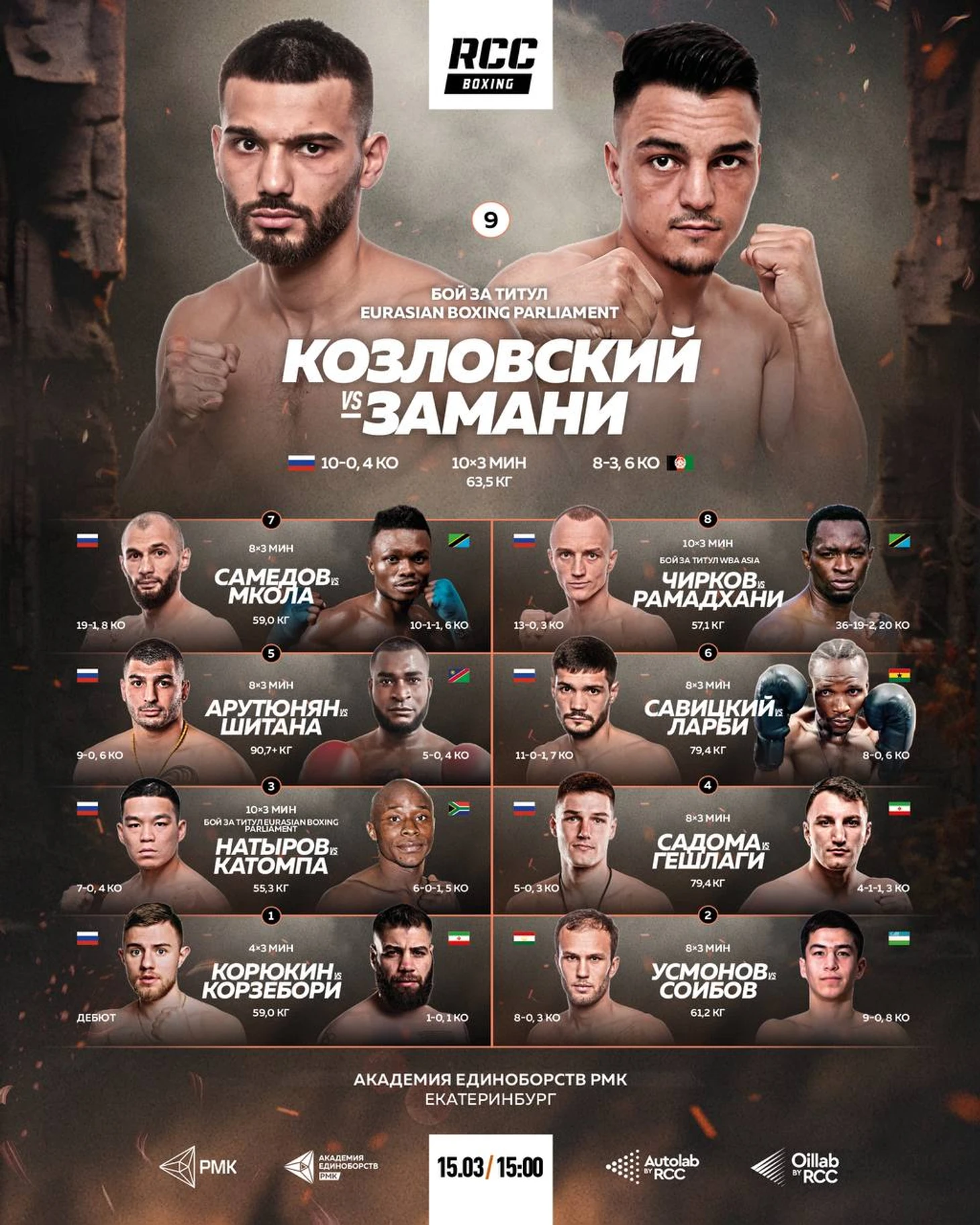Завтра, 15 марта, в Екатеринбурге состоится 80-й турнир под эгидой RCC Boxing Promotions. На арене Академии единоборств РМК состоится большой международный вечер бокса, который возглавит бой за пояс Eurasian Boxing Parliament между Иваном Козловским и Мохаммедом Замани.