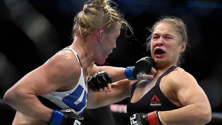 На мой взгляд, в поражении Раузи нет ну абсолютно ничего нелогичного. Если посмотреть на ее поведение перед боем с Холм, то становится понятно, что иного исхода и быть не могло. Этим этот поединок отличается от тех, что будут выше, где итог был абсолютно непредсказуем. Напомню, что перед боем с Холм (многократной чемпионкой мира по боксу), Раузи на всех углах кричала, что побьет ее в стойке, и чуть ли не вызывала на бой по правилам бокса Флойда Мейвезера. У Раузи был отвратительный тренер (Эдмонд Тавердян), раздутое ЧСВ и абсолютное непонимание того, что все ее успехи связаны не только с крутостью ее навыков, сколько со слабостью оппозиции. Напомню, что никто из девушек, которых она побеждала (за исключением Миши Тейт), после боя с ней, ни разу не дрался в титульных боях. И дело не в том, что Раузи забирала у них душу – просто ни одна из девушек не соответствовала современному уровню ММА. А Холм с ее отточенной ударкой и неплохой защитой от тейкдаунов – соответствовала, что и позволило ей развеять ауру непобедимости Ронды Раузи.