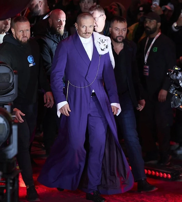 Еще один костюм перед реваншем – в фиолетовом цвете с удлиненным двубортным пиджаком и меховой накидкой, на которой тоже изображен кот. Фиолетовый – любимый цвет отца Усика, который умер в 2012 году.
