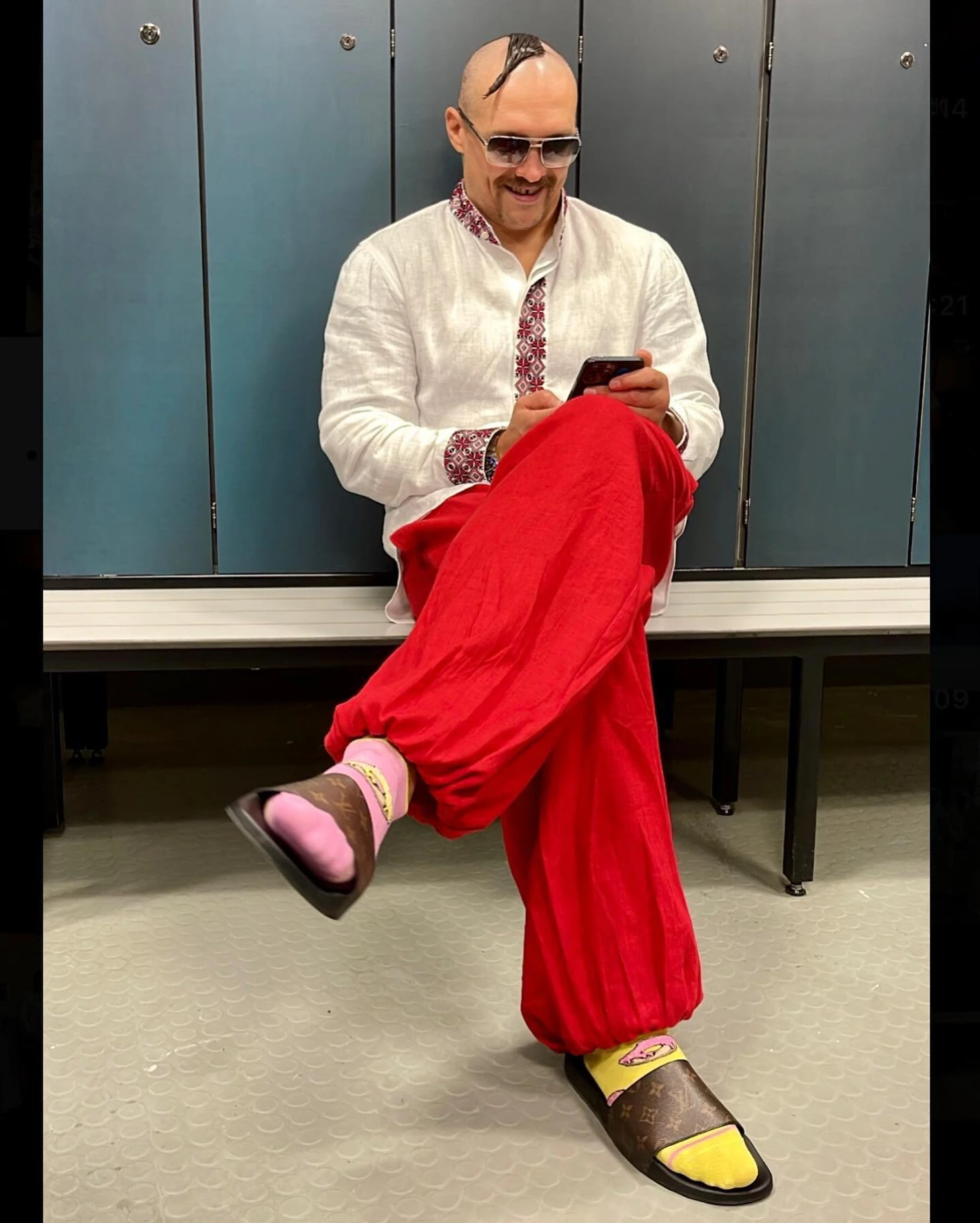 На пресс-конференции перед реваншем с Энтони Джошуа в августе-2022 Усик появился в традиционном образе казака: вышиванка, красные шаровары и традиционный казацкий чуб.