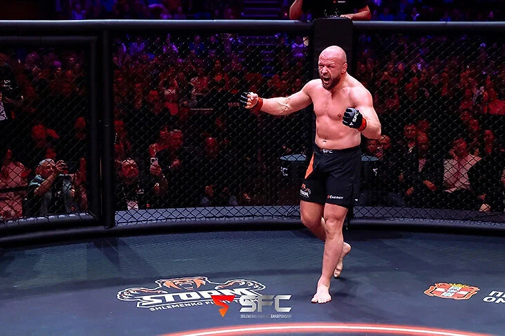 21-летний полутяж Александр Шепель, главный проспект зала Шлеменко, выигрывает первый бой в ММА и уже сейчас не хуже Алекса Перейры имитирует стрельбу из лука. Видно, что у него очень много энергии.