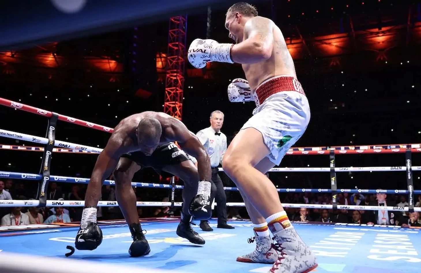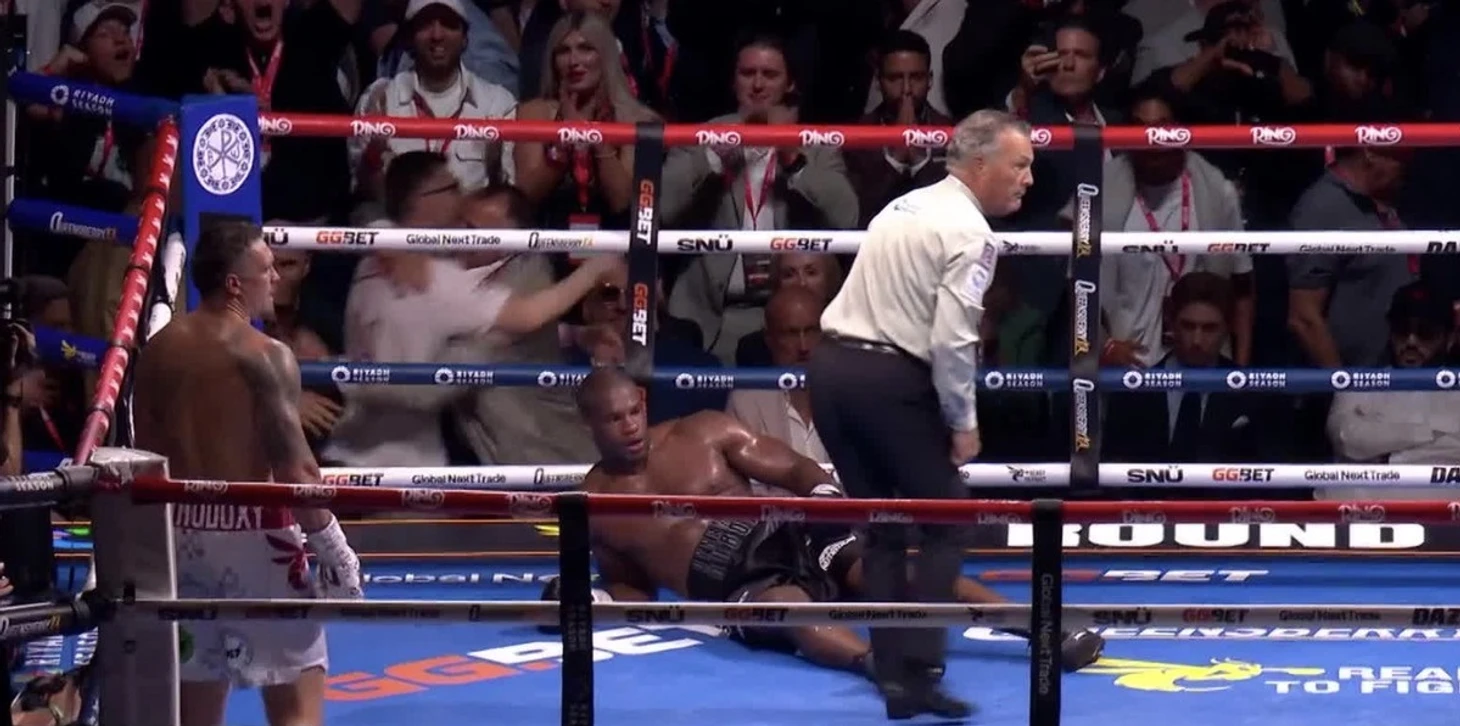 Первый нокдаун случился в очередном, на первый взгляд удачном моменте для Дюбуа в углу ринга. В похожей ситуации он закончил свой прошлый бой с Энтони Джошуа. Все опасные моменты и в этом поединке случались так же в углах ринга. Усик как будто знал и специально зазывал претендента в угол. Подобное не раз делал «Величайший» Мохаммед Али, не удивлюсь если и Александр подметил важные для себя знания, из боев Дюбуа. Именно размен в углу и стал роковым, для британского нокаутера. Усик был быстрее и хитрее. Его правая нашла висок и отправила Даниэля на канвас. Удар не выглядел страшным, но в этот момент все стало ясно и всему стадиону и самому Дюбуа. Усик это понял еще раньше.