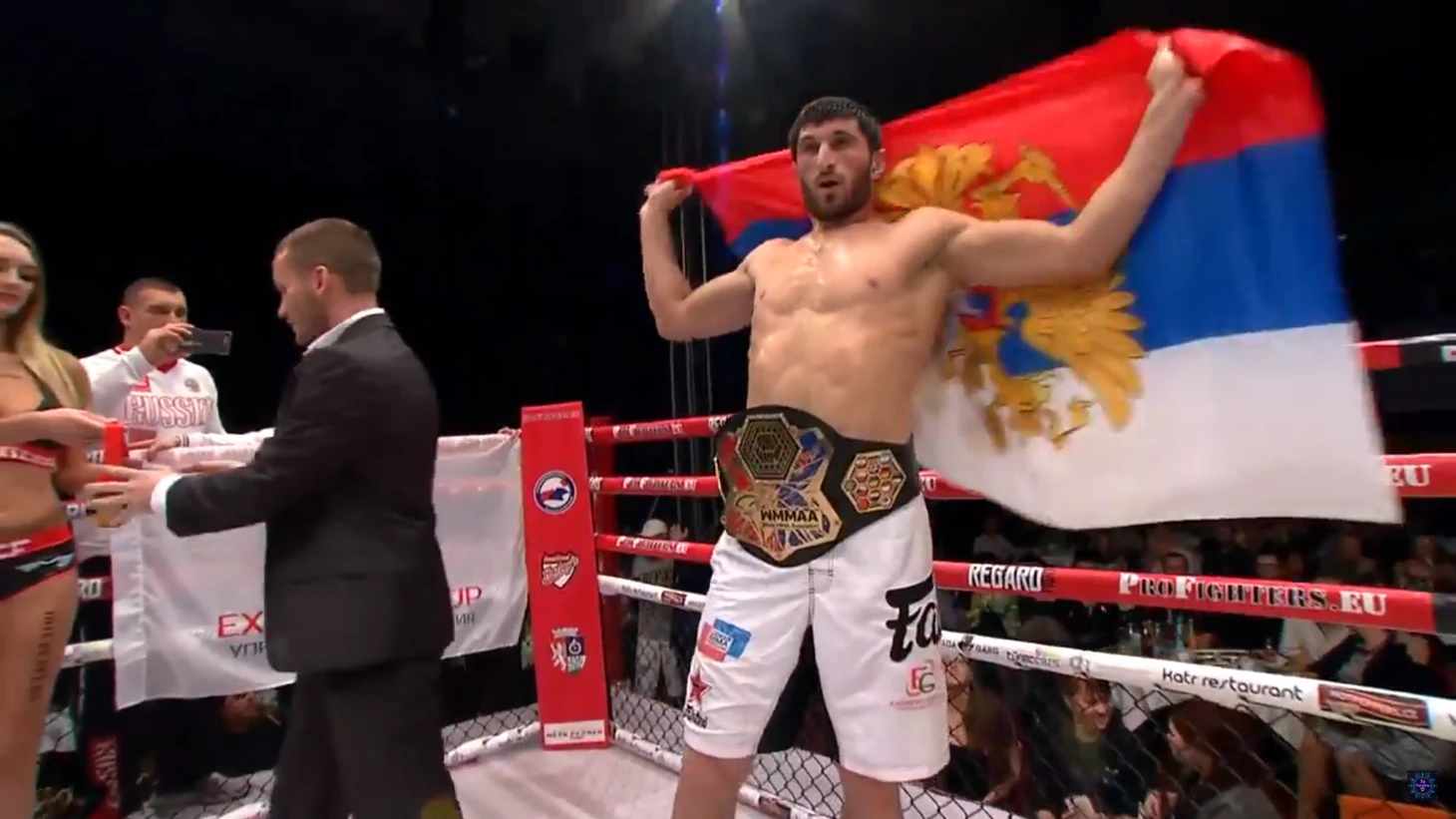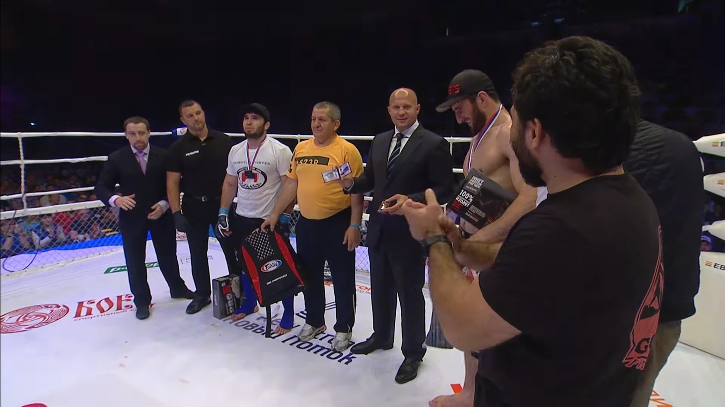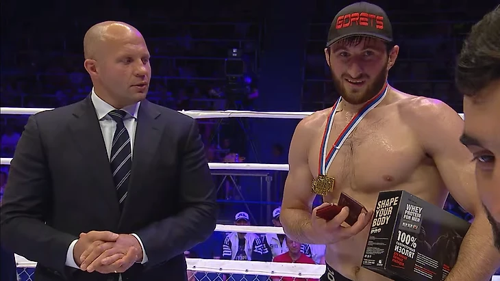 После боя на ринг вышел Федор Емельяненко: лично вручил Анкалаеву пояс, а с ним – удостоверение первого в России мастера спорта международного класса по ММА. Приятным бонусом – новые перчатки и сывороточный изолят.