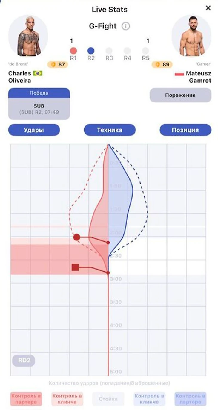 В первом раунде Оливейра выбросил больше ударов 15:11 и чаще попадал – 8:4. При этом более 60% времени контроль на земле оставался именно за Чарльзом. Закономерно, что судьи на основе искусственного интеллекта в приложении Stats Fight оценили 5-минутку со счетом 10:9 в пользу экс-чемпиона. Ознакомится с ИИ-оценками боев всего турнира UFC можно в приложении, доступно в AppStore и Google Play.