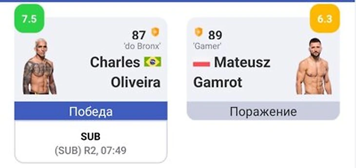 Оливейра быстро забирает спину, выходит на ущемление челюсти и заставляет Матеуша сдаться. Очередная досрочная победа Чарльза!