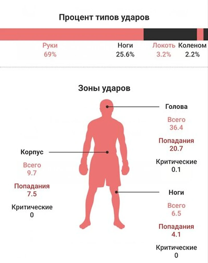 Если это удастся, то в ударке мы увидим настоящий декласс от “Драго”! По данным Stats Fight, Волков за минуту выносит 10.53 ударов (в два раза больше Алмейды) с точностью 61%. Логично, что 22 победы из 38 отечественный файтер одержал нокаутами. Более 70% от общего количества времени в раунде Александр проводит в стойке. А в своих атаках россиянин весьма разнообразен, что подтверждает схема его ударов: