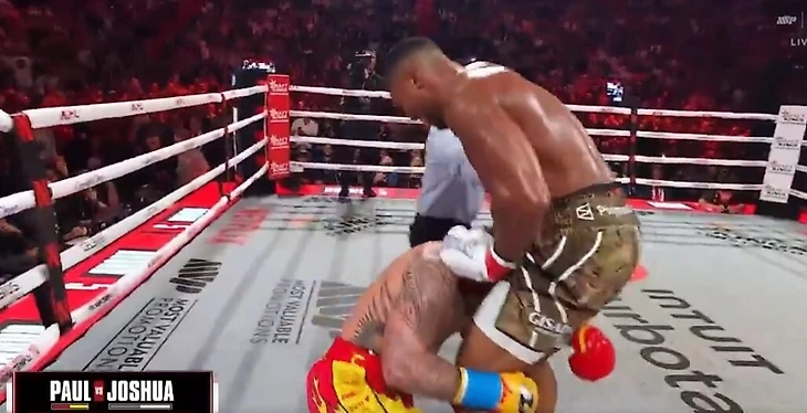 С четвертого раунда Джошуа наконец-то включился и четыре раза отправил Пола в нокдаун. Тот падал и хватался за ноги соперника: